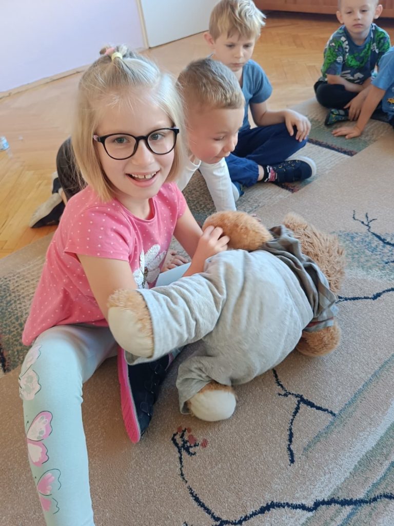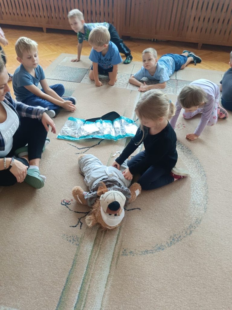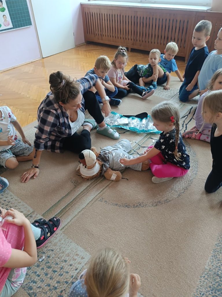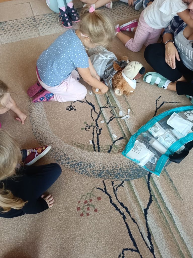 13 września obchodziliśmy Światowy Dzień Pierwszej Pomocy. Dzieci dowiedziały się, jak ważne jest udzielanie pomocy w razie potrzeby. Uczyły się m.in. bezpiecznej pozycji oraz ćwiczyły swoje umiejętności, naklejając plasterki na pluszowego misia.