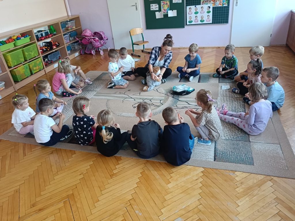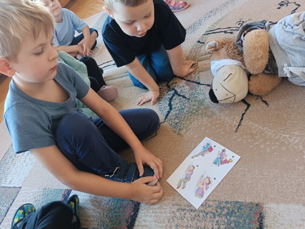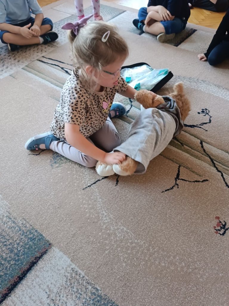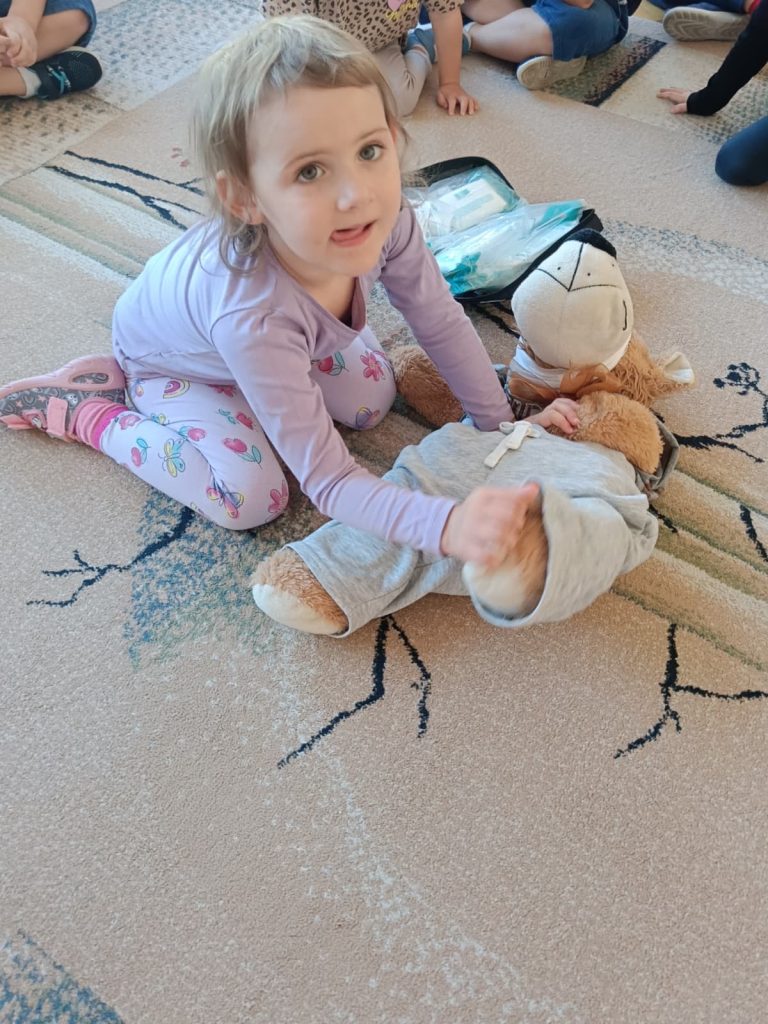 13 września obchodziliśmy Światowy Dzień Pierwszej Pomocy. Dzieci dowiedziały się, jak ważne jest udzielanie pomocy w razie potrzeby. Uczyły się m.in. bezpiecznej pozycji oraz ćwiczyły swoje umiejętności, naklejając plasterki na pluszowego misia.