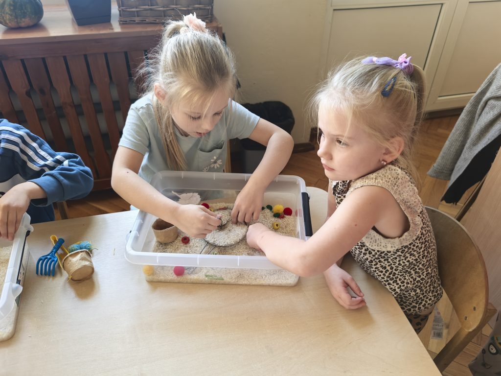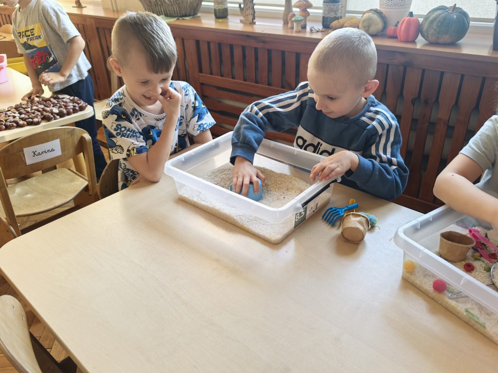 Przez całą jesień dzieci miały do dyspozycji jesienne boxy sensoryczne. Podczas zabawy dzieci przesypywały, przenosiły materiały łyżeczkami i szczypcami, przesiewały przez sitka, ćwicząc motorykę małą. Ponadto: sortowały, poznawały różne faktury, tworzyły własne kompozycje i prowadziły swobodną zabawę badawczą, rozwijając ciekawość i kreatywność.